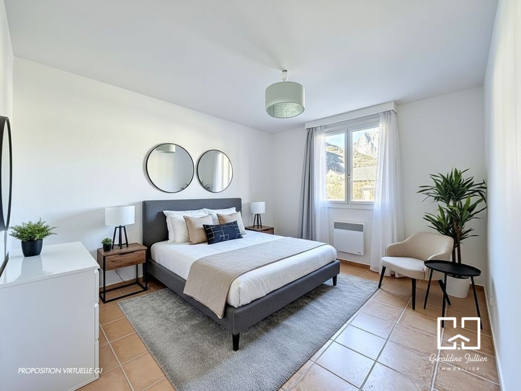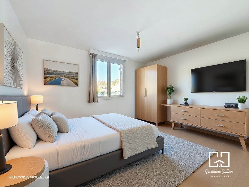 Il se compose d’un séjour lumineux avec cuisine meublée et équipée, de trois chambres dont une avec salle d’eau privative, d’un bureau, d’une seconde salle de douche et d’un cellier avec branchement lave-linge.