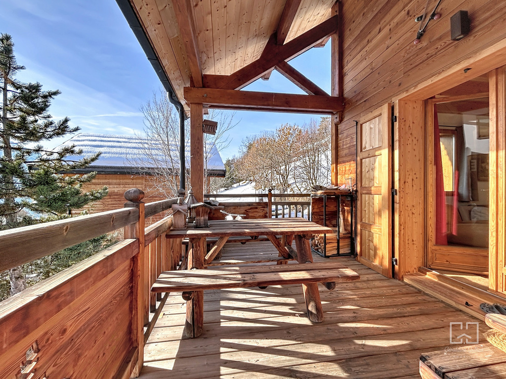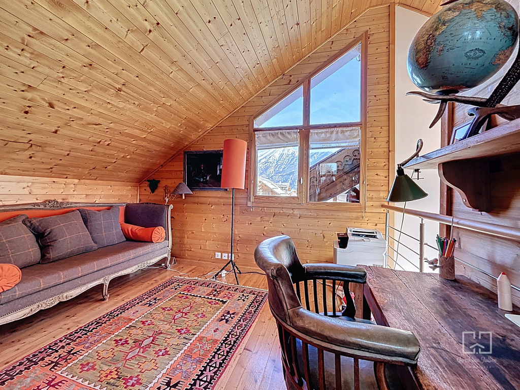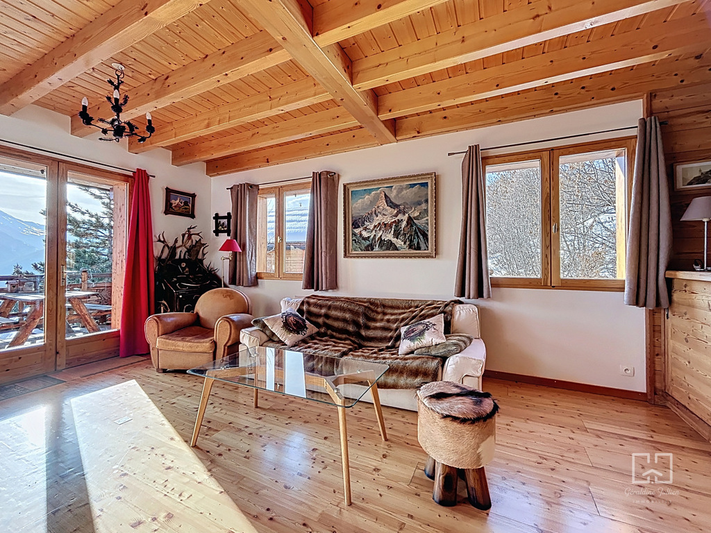 La pièce de vie cathédrale, baignée de lumière, séduit par ses volumes, sa charpente apparente et sa cheminée centrale. La cuisine spacieuse s’ouvre sur une grande terrasse abritée en mélèze, avec une vue exceptionnelle sur les sommets. À l’étage, une suite parentale dispose d’un balcon privatif et d’une salle d’eau.