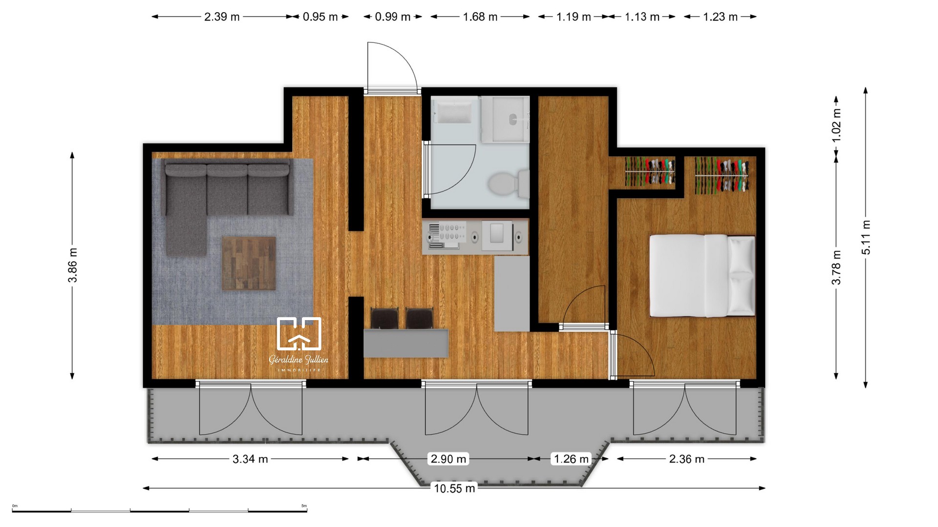 Il se compose d’une entrée, cuisine meublée avec coin repas, d’un salon, d’une chambre le tout donnant sur un balcon ensoleillé, d’un espace bureau ou dressing au choix, ainsi que d’une salle de douche avec WC et emplacement prévu pour un lave-linge.